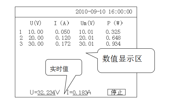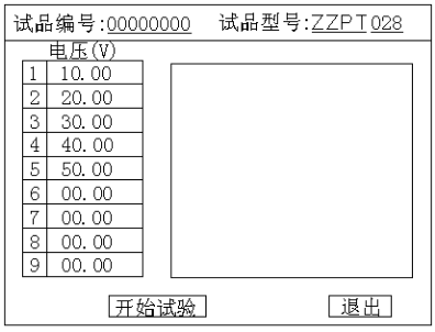 此界面的最上部显示当前的电压频率,中间为主显示区,显示已经捕捉到的数据记录,最下方为当前电压、电流的实时值。在此界面下调节调压器升压仪器将自动采集、显示所有参数在各测试点的测量数值。直至到最大设定电压值,仪器蜂鸣器发出提示音,提示数据测量完毕。此时应迅速将调压器回零。