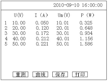 在当前界面中按键盘上的“↑”“↓”键可以遍历测量结果,按“保存”可以将当前测试结果保存到仪器的存储器中便于以后查阅,按“打印”可以将当前试验结果通过面板打印机打出,按“曲线”键后仪器将根据所测数据绘制出如图6所示“电压电流关系”曲线图。