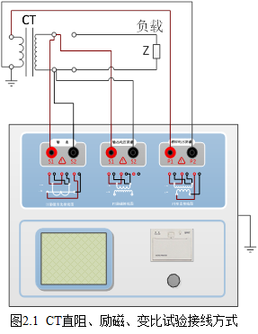 第一步:根据表2.1描述的CT试验项目说明,依照图2.1或图2.2进行接线(对于各种结构的CT,可参考附录D描述的实际接线方式)。