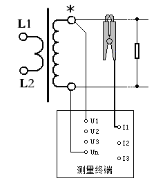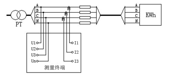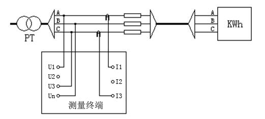 在PT侧进行测试:PT侧A、B、C、N相电压线分别接到测量终端的U1,U2,U3,UN端子上;用三把钳形电流互感器分别卡到PT侧各相上,注意:相别一定要对应,否则测试结果不正确。