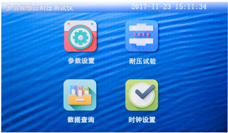 主界面菜单一共有四个功能菜单分别是“参数设置”、“耐压试验”、“数据查询”。“时钟设置”菜单。