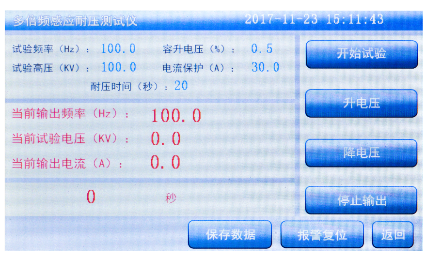 1)开始试验:开始输出,自动模式下,主机自动升压到高压输出设定值,手动模式下,允许通过“升电压”,“降电压”按钮,单步升/降电压。