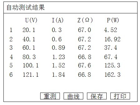 此界面的最上部显示当前的电压频率,中间为主显示区,显示已经捕捉到的数据记录,最下方为当前电压、电流的实时值。在此界面下调节调压器升压仪器将自动采集、显示所有参数在各测试点的测量数值。直至到最大设定电压值,仪器蜂鸣器发出提示音,提示数据测量完毕。此时应迅速将调压器回零。