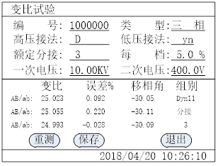 在此升压界面中,仪器会根据变压器的变比自动升至合适电压,并测试变比、误差、移相角,此过程会在10秒钟以内完成,如果测试过程中出现错误会提示错误信息,测试完成会出现如下图所示测量结果页面。