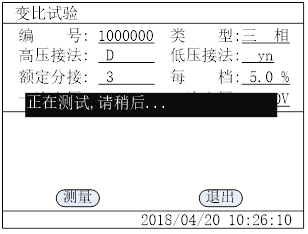 1、在上图中,光标选择“测量”,按确认键进入如下变比测试自动升压页面: