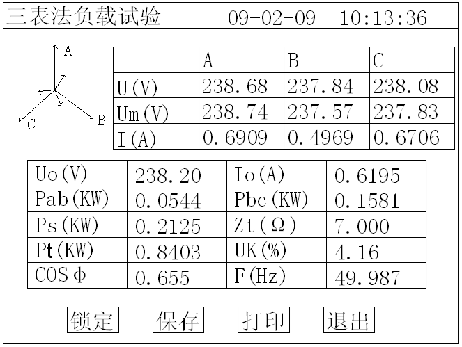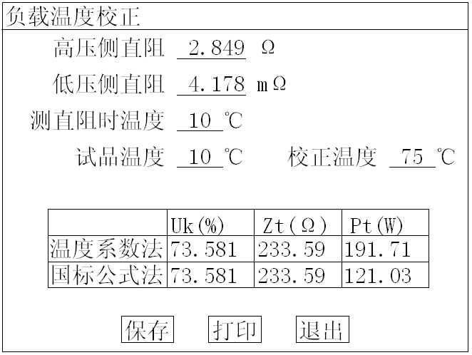 上图显示负载试验时当前温度下的所有测试数据:Uav(V)为当前三相电压的平均值,Io(A)为三相电流的平均值,Ps(KW)为当前电压下的实测功率, Pt(KW)为当前温度下校正到额定电流时的复载损耗,Zt(Ω)为当前温度下的短路阻抗,Uk%为当前温度下的短路电压百分比。