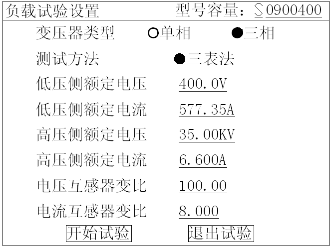 该页面保存上次试验时的设置值,检查、修改该页面中的设置值使其与当前试验变压器一致,尤其要注意检查编号的后5位所代表的容量值、高压侧额定电流、电流互感器变比等,避免设定值错误或者试验电流超量程。