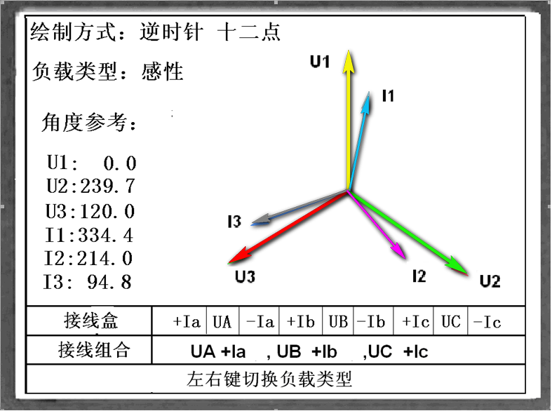 用户可以按照负载选择参考向量图,左右键可以切换负载类型。其中电压电流分组显示,例如感性负载时显示UA +Ia,UB +Ib,UC +Ic,表示向量图中U1接的是UA,I1接的是正向Ia,U2接的是UB,I2接的是正向Ib,U3接的是UC,I3接的是正向Ic,正负号表示电流极性。
