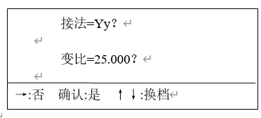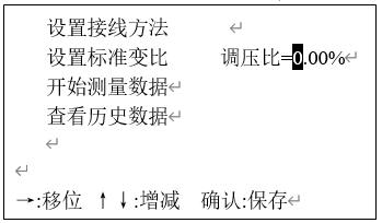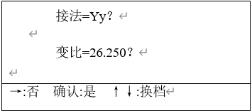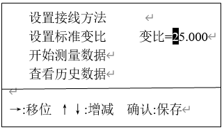 每按“↑”键一次,变比增加25.000×5%,即1.25。每按“↓”键一次,变比减少1.25。新的标准变比直接显示在屏上,按确认键,即可测量出结果。