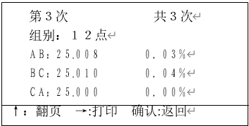 第一行左边显示本次数据在历史数据中的位置,右边显示历史数据的个数。第二行为组别。第三行左边为AB相的变比,第三行右边为AB相的相对误差,依此类推。如果测单相变压器,只有前三行显示。如果实测变比的相对误差大于10 %,显示“>10%”, 如果实测变比的相对误差小于-10 %,显示“<-10%”。
