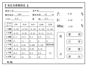 进入电压互感器检定界面后,仪器自动显示比差、角差以及百分表,同时在升压过程中仪器自动把测试数据记录到表格中,仪器自动对数据进行化整处理,所有的数据测量完成后,根据规程给出被测互感器误差是否合格的结论。