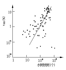 在对已运行过的XLPE电缆进行加速老化试验,得出水树枝发生的个数以及最长的水树枝长度与电缆tan 测量值的关系,如图1-8及图1-9所示,它们的趋势是明确的,但分散性很大。如将最长的水树枝长度与每单位长度电缆中的树枝数的乘积作为横坐标,则与测得的tanδ(纵坐标)之间具有更好的相关性,说明测得的tanδ值取决于整体损耗的变化。