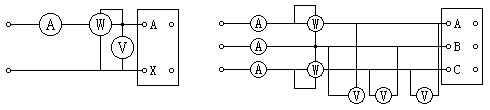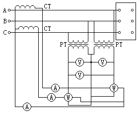 对于单相电力变压器,可采用图1-1所示的接线进行空载试验。对于三相电力变压器,可采用图1-2和图1-3所示的两瓦特表法进行空载试验。图1-2为直接测量法,适用于额定电压和电流较小,用电压表和电流表即可直接进行测量的电力变压器。当电力变压器额定电压和电流较大时,必须借助电压互感器和电流互感器进行间接测量,此时采用图1-3接线方式。